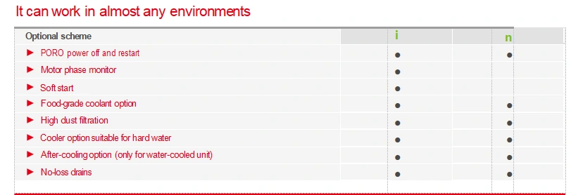 Наші компресори пропонують охолоджувачі харчового класу, фільтри з високою пиловою фільтрацією та охолоджувачі жорсткої води та інші опції, адаптовані до суворих умов, які можуть задовольнити ваші численні потреби.