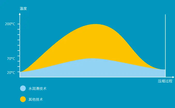 Вода має чудову охолоджувальну здатність і ефективно відводить тепло від джерела. Енергозатрати, спричинені утворенням тепла, усуваються, і на кіловат енергії може вироблятися більше стисненого повітря. Більш холодне стиснене повітря зменшує термічне навантаження на компоненти, тим самим подовжуючи термін служби.
